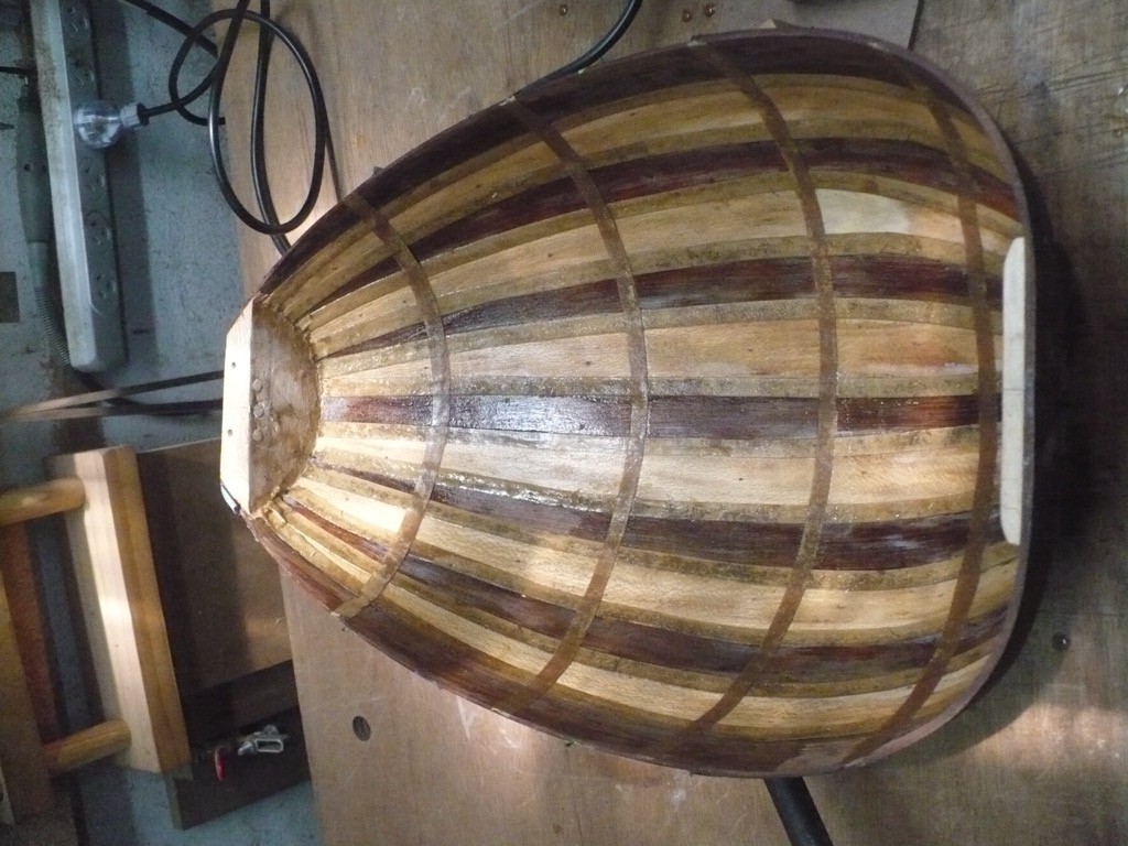 The final step, once all the strips are in place, is to remove any glue lumps and even it all out. I did this by diluting the remaining glue a little and taking first a paintbrush dipped in the mix, then a wetted rag, to the inside. This is one way of sealing the insides. This is it all done (though still wet)