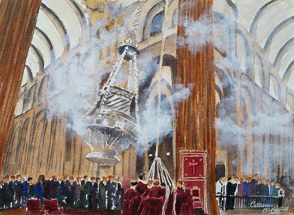 Doofus and the Duck present, in honour of all those who have walked the O Camiño de Santiago (The Way of St James) to the cathedral of Santiago de Compostela in Galicia and in presage of Australia’s contribution to the upcoming COP-26 Talks on Climate Action, their tableau of a work by living Canadian watercolor artist Catherine McCoy (completed as part of her pilgrimage), entitled “Botafumeiro of Santiago (2015),” starring the ABC Interpretive Dance Bandicoot as Sant Iago (St James the Great) in the Guise of a Pilgrim; and featuring the Purple Hippo, the Little Sheep, China Baby, and Fluffy the Three-Headed Dogs as The Tiraboleiros; and introducing the Thurible of St Francis of Assisi Church (Paddington) as the Mighty Botafumeiro de Compostela