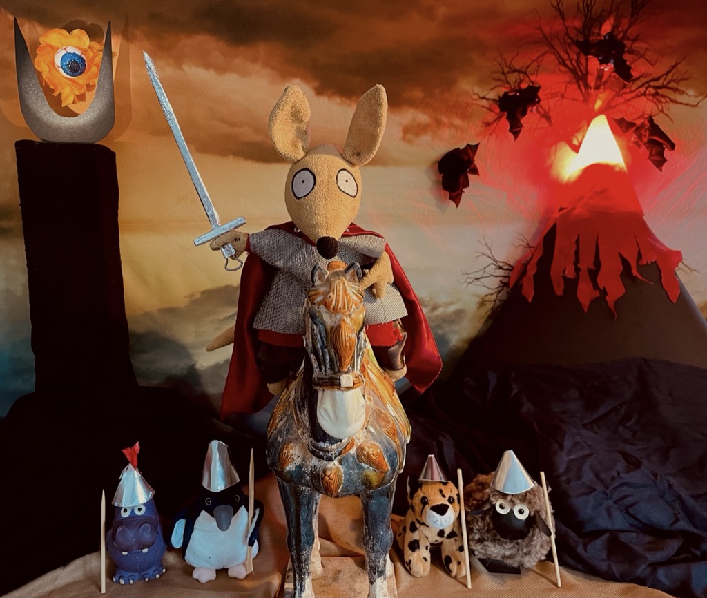 Doofus and the Duck present, as the last in their series of Kings and Things and as part of their on-going series of iconic movie posters, their tableau of a theatrical release poster for the last in Peter Jackson and Fran Walsh’s “Lord of the Rings” Trilogy, entitled “Lord of the Rings: Return of the King (2003),” starring the ABC Interpretive Dance Bandicoot as Aragorn, Son of Arathorn, King of Gondor, Lord of the Dúnedain, Wielder of Andúril, Elessar, Leader of the Armies of the West in the Final Battle against Sauron; and introducing the Colorful Pottery Horse as The Faithful Warhorse, Roheryn; and featuring the Purple Hippo, the Little Sheep, the Little Cheetah, and the Little Penguin as The Army of the West; and the Little Blue Men as Nazgul