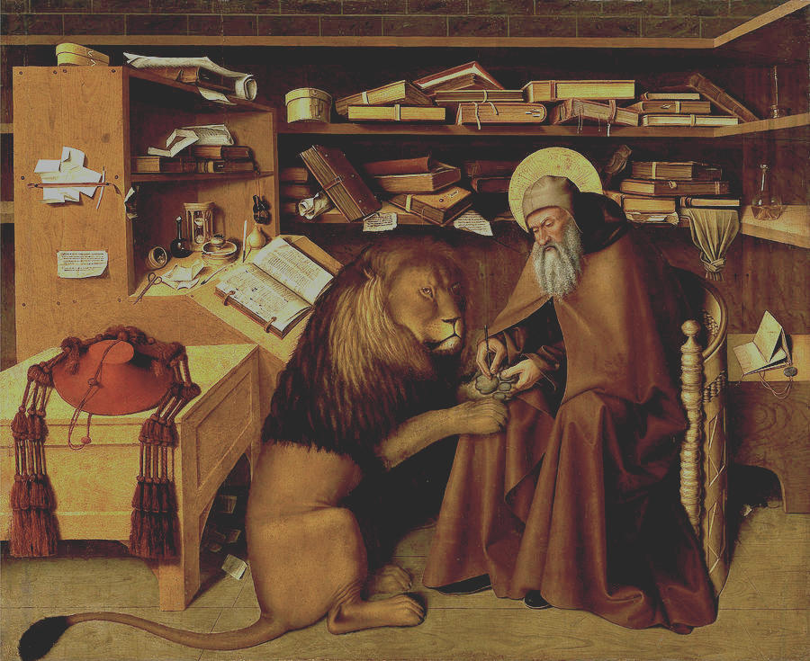 Doofus and the Duck present, in commemoration of the 1602 anniversary of the death of the Saint (Catholic, Lutheran, Eastern Orthodox, Anglican) and Doctor of the Church (of Rome), and in honor of the Feast Day of the same, Jerome of Stridon, their tableau of a work by the Early Renaissance Neapolitan artist Niccolò Antonio Colantonio, part of an altar piece from the church of San Lorenzo Maggiore (also in Naples), entitled “Saint Jerome in His Study (c.1445-1446),” introducing the Possum Hand Puppet as The Mighty, Yet Humble, Lion
