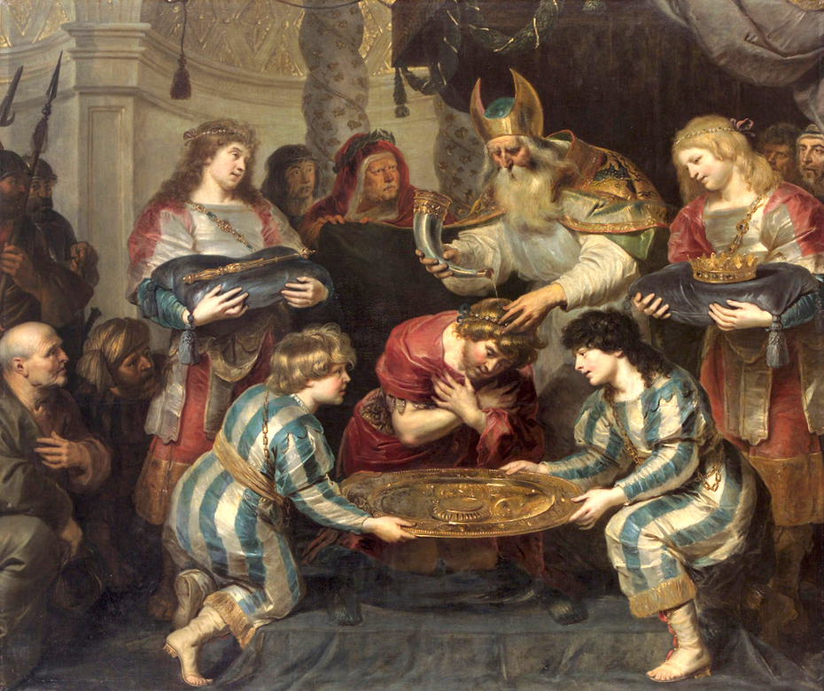 Doofus and the Duck present, as part of their King Charles the Spaniel Third of His Name Coronation series and in honour of International Quiche Appreciation Day, their tableau of a religious painting by the 17th century Flemish artist and art dealer Cornelis de Vos, entitled “The Anointing of Solomon by Zadok the Priest (1630),” starring the ABC Interpretive Dance Bandicoot as The Great, Mighty, and Wisest of Kings, Solomon the Temple Builder; and Shaun the Sheep as The Preeminent Prelate, Zadok, High Priest of Israel; and featuring the Purple Hippo and the Little Penguin as the Stripey Servants, and the Little Sheep as Toots the Horn Blower