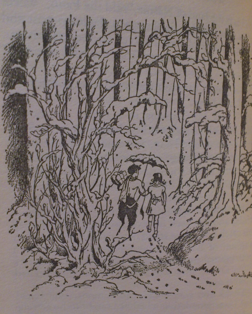 Doofus and the Duck present another tableau in their series of Famous Illustrations, from the pen of illustrator Pauline Baynes, her interpretation of Lucy and Mr Tumnus from C. S. Lewis’s much loved, “The Lion, the Witch, and the Wardrobe,” featuring the ABC Interpretive Dance Bandicoot as Mr Tumnus, A Rather Cold Faun, and the Purple Hippo as Lucy