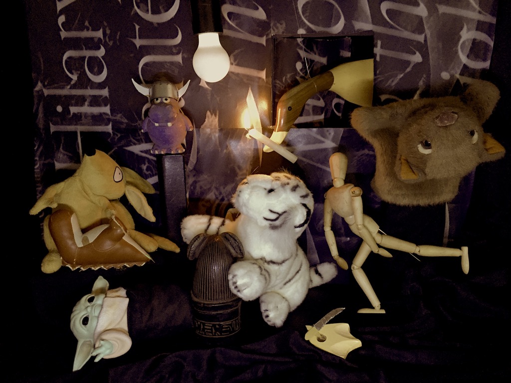 Doofus and the Duck present, as part of their series of famous children’s book illustrations, their tableau of a panel from German-born British author and artist Judith Kerr’s most well-known work, “The Tiger Who Came To Tea (1968),” featuring the Purple Hippo as The Kind Girl Called Sophie, and introducing a special guest appearance by Cyril the Leopard as The Tiger