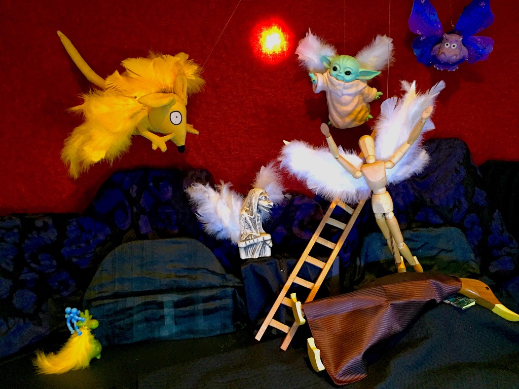 Doofus and the Duck present their tableau of a late work by Russian-French modern master Marc Chagall, entitled “Jacob’s Ladder (1973),” starring the ABC Interpretive Dance Bandicoot as The Golden Angel of The Lord, and featuring the Purple Hippo as a Blue Angel