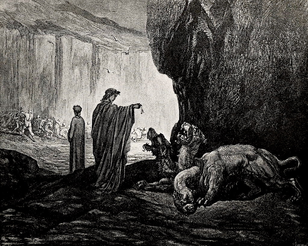 Doofus and the Duck present, as part of their on-going series of great illustrators, their tableau of the French Romantic artist and engraver Gustave Doré’s depiction of Canto 6 from Dante Alighieri’s “L’Enfer (Inferno) – The Third Circle of Hell (1857),” featuring the Purple Hippo as the Great Poet Dante, and introducing the Little Blue Men as Gluttons in Hell, with a Special Guest Appearance by Fluffy the Dog as Cerberus