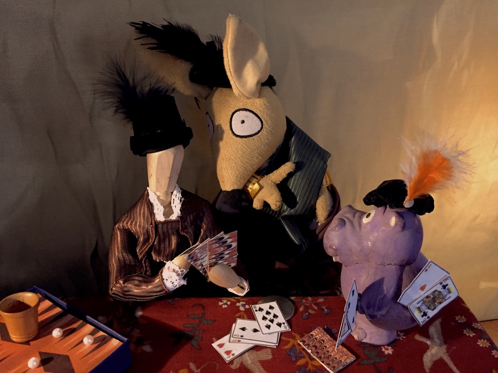 Doofus and the Duck present, their tableau taken from the work of esteemed Italian Baroque painter Michelangelo Merisi da Caravaggio’s early secular work, entitled “The Cardsharps (c.1594),” starring the ABC Interpretive Dance Bandicoot as Malfonzo di Barberoni, a Down-at-the-heels Nobleman Who’s Luck is About to Change, and featuring the Purple Hippo as A Young Card Sharp