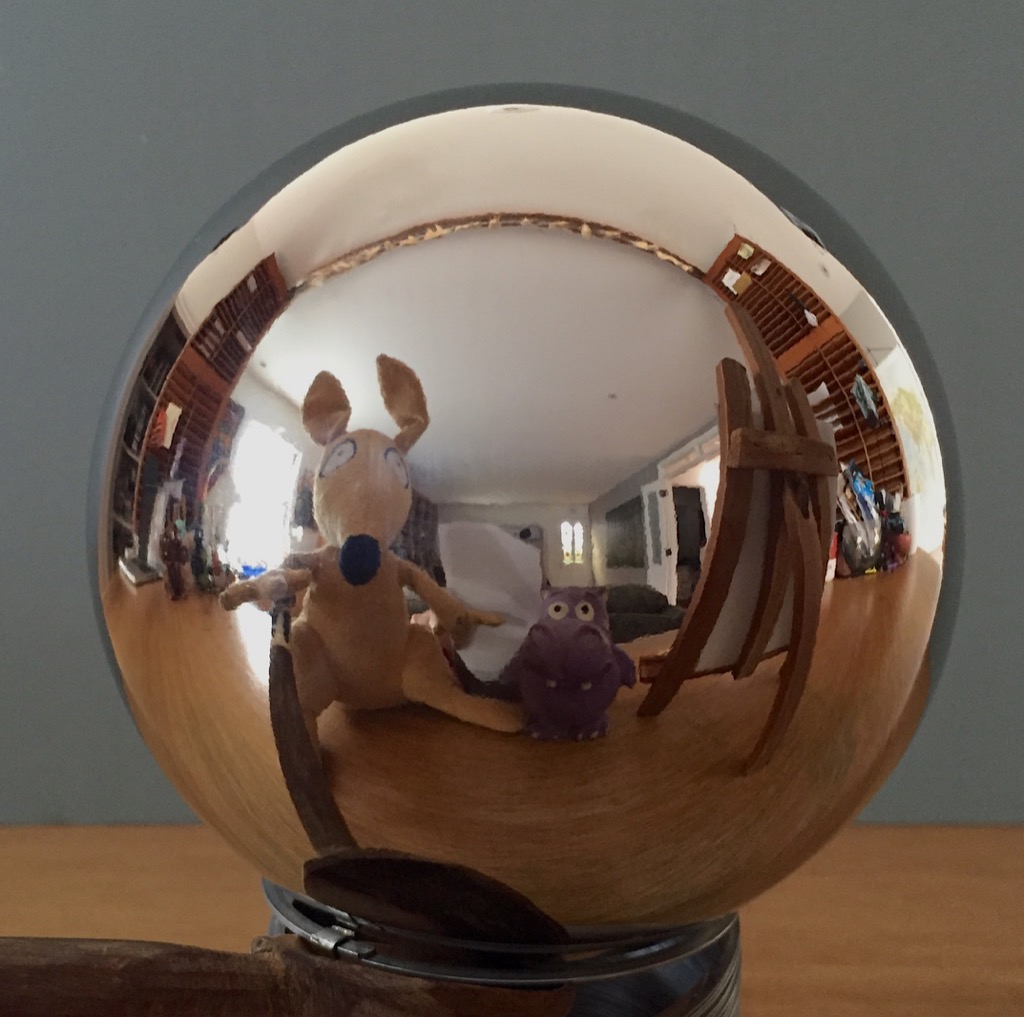 Magnificent! The wondrous meta-effect of having the artist inside the sphere observing us, as opposed to Escher’s exquisite meditation of a self-portrait, is sheer genius, adding an entire new level of meaning to an already mysterious work. Bravo!
