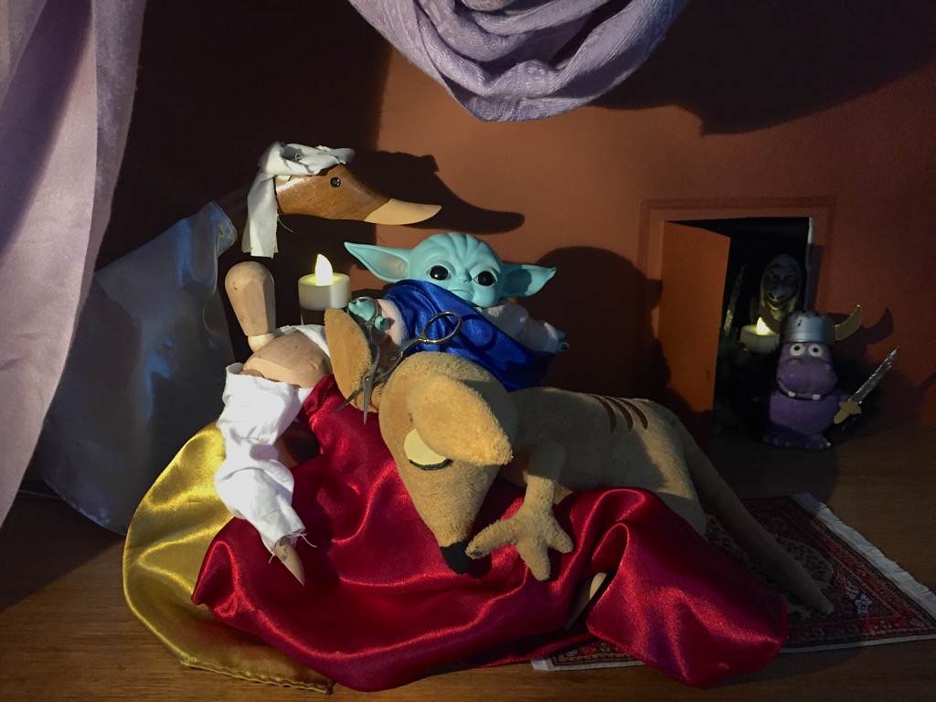 Another superb Caravaggio from the Company, with the ABC Interpretive Dance Bandicoot as a menacing older man, the Purple Hippo as his young accomplice, and Doofus as the rich young dupe. Beautifully set, rich in tone and detail, with a delightful lighting that gives that direct feeling of the original. Magnificent!